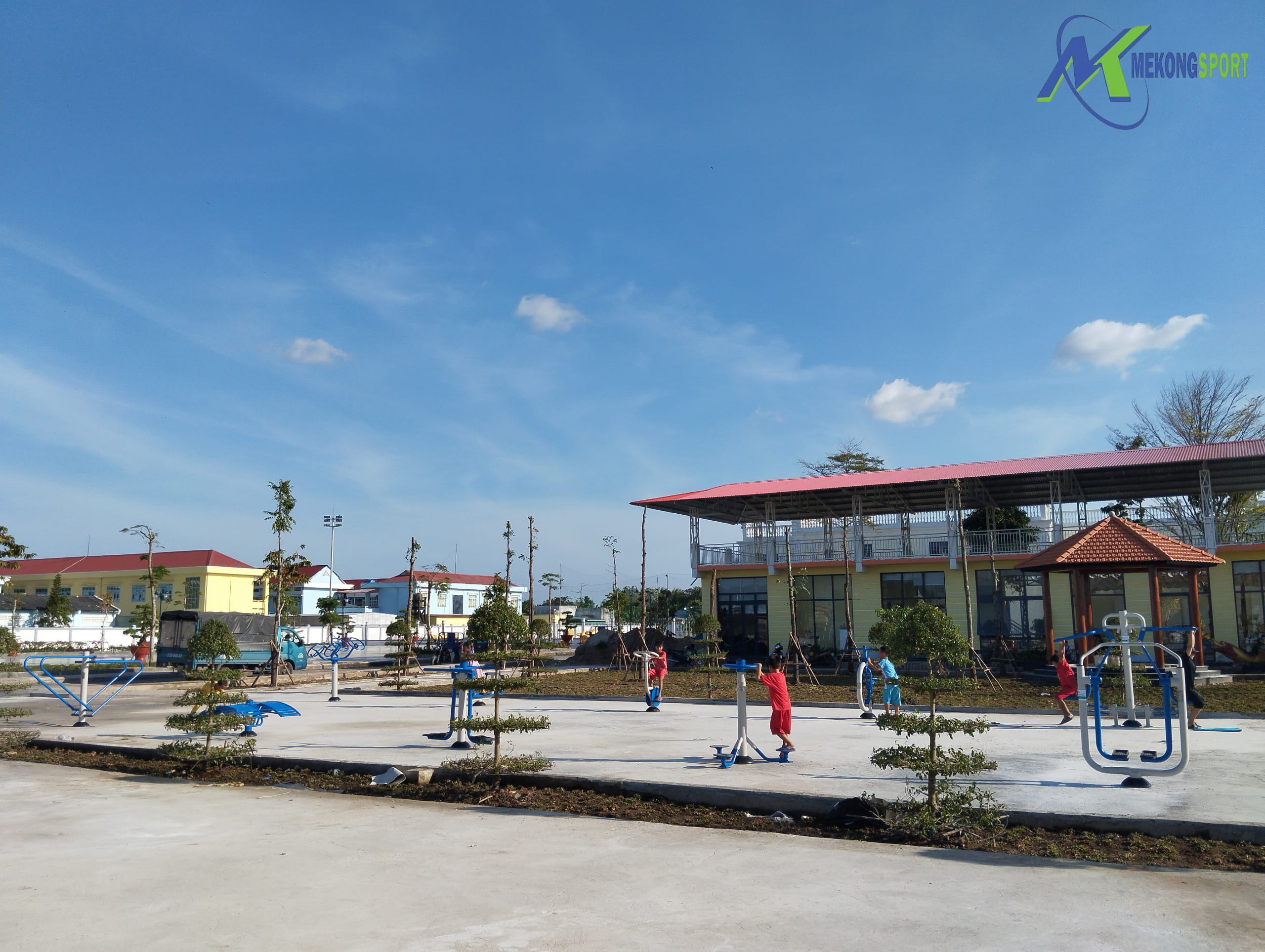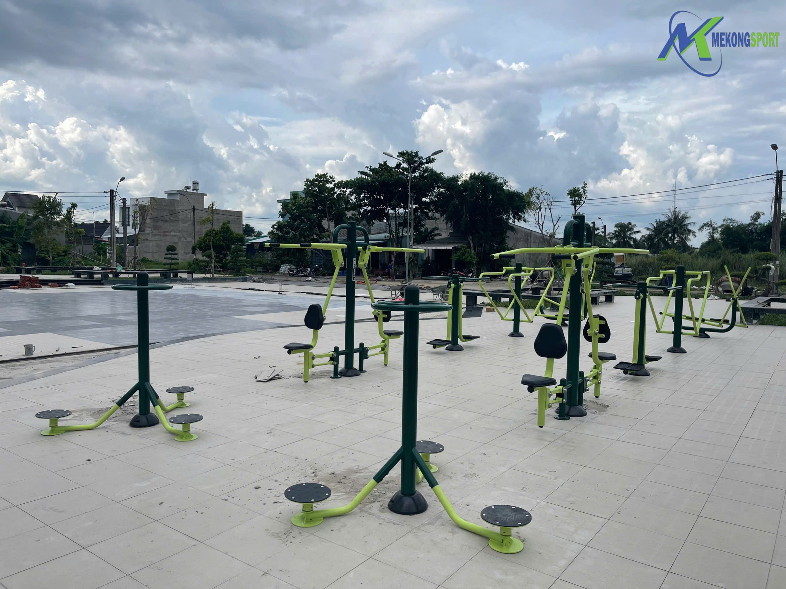 Toàn bộ thiết bị do Mekongsport tư vấn, cung cấp và lắp đặt trên một khu sinh hoạt cộng đồng rộng, thoáng mát và bằng phẳng. Các thiết bị đều có trụ bằng thép cao cấp, nhúng kẽm nóng và phun sơn tĩnh điện chống gỉ sét màu cam rất bắt mắt.